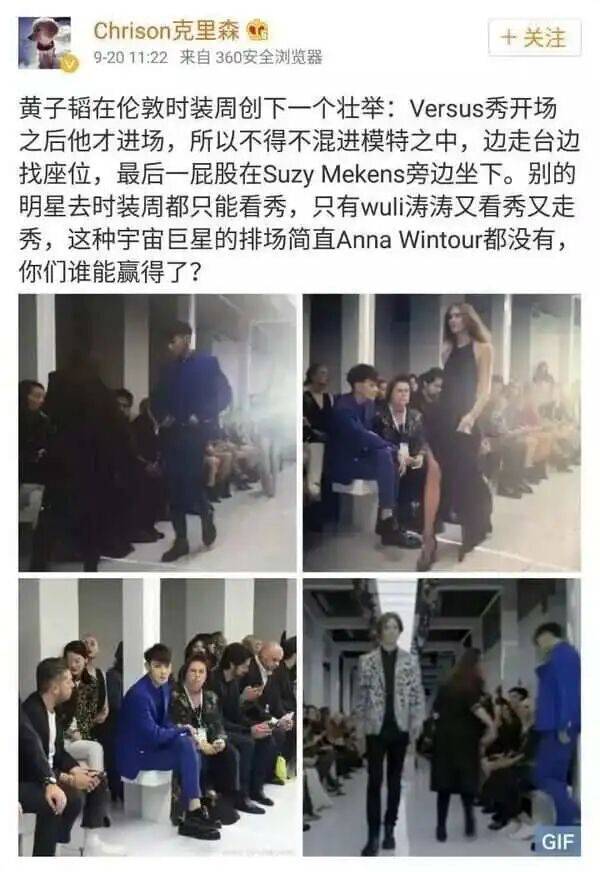 没过多久,他又在伦敦时装周闹下笑话。看秀迟到怎么办?wuli韬韬想到了绝佳办法,那就是混进模特队伍。黄子韬在T台上边走边提着裤子的松紧带,最后一坐在著名时尚评论人Suzy Mekens旁边,看得suzy目瞪口呆。