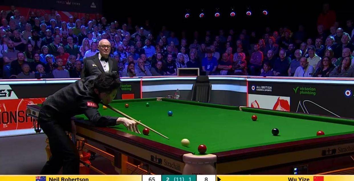 关键的第四局过程更是跌宕起伏。 罗伯逊长台进攻未进,给吴宜泽留下了一个绝佳的上手机会。 但吴宜泽上手后仅得8分,又出现了一个简单的失误。 随后,罗伯逊通过一杆左侧底袋的架杆上手,开始连续得分,他一口气进攻到65分,此时台面剩余59分,罗伯逊领先57分,但尚未完成超分。 就在这时,场外疑似有手机铃声响起,罗伯逊受到干扰出现失误,中断了进攻。 这意味着吴宜泽只要清台就能逆转。