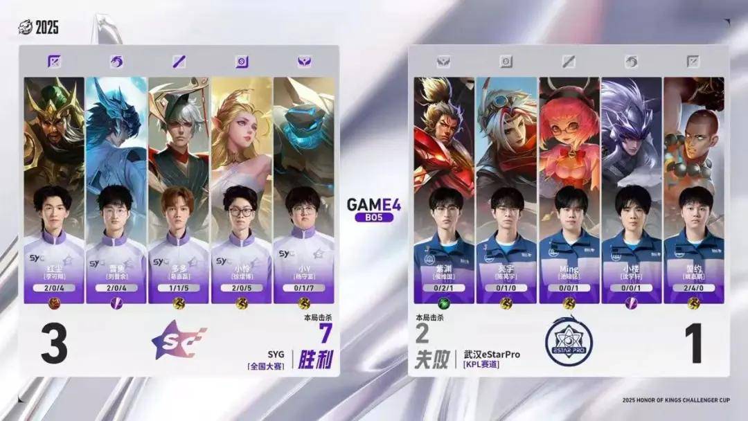 最终,SYG选择了版本热门辅助空空儿以及盾山作为本局的“天命英雄”,武汉eStarPro显然准备不够充分。STG仅耗时10分29秒,便推平了武汉eStarPro的水晶,大比分定格在3-1,成为本届挑杯首支越级挑战成功的队伍。