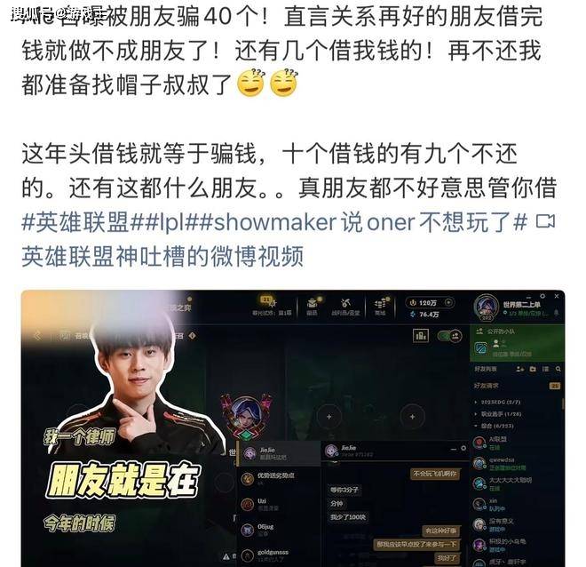 就在最近,lpl赛区的知名上单选手ale在直播的时候公开透露了一些事情,他表示,自己被朋友骗了40个w。并且直言关系再好的朋友,借完钱之后真的就做不成朋友了,还有几个借钱的。据透露也是非常的多,甚至有十几w20w的,如果再不还钱的话他就准备去找叔叔了。这年头借钱就等于骗钱,十个借钱的有九个不还的,都是什么朋友啊?说实线个w,甚至还选择要主动放弃,估计这个朋友的关系应该也非常微妙嘛,说不定是女性朋友。