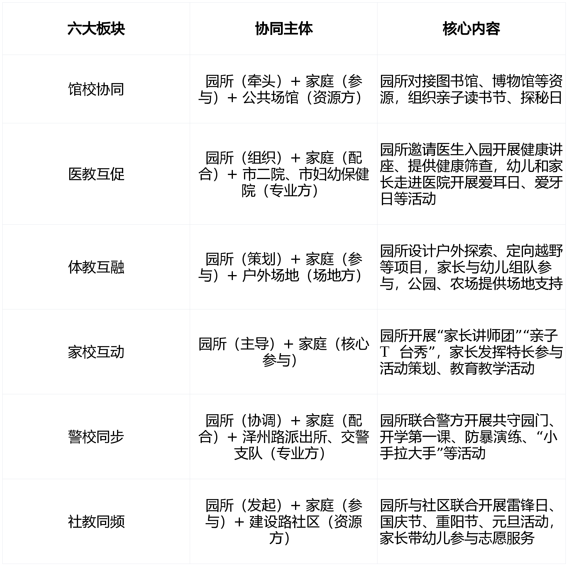 1. 园所端枢纽作用:通过家长学校、家园教研工作坊,建立“问题共研—方案共创—成效共评”闭环,以《幼儿行为观察记录表》等工具实现科学评估。为家长提供基于儿童发展理论的专业支持,帮助他们成为孩子终身学习的引路人。通过园长信箱、园长接待日等建立开放、平等的沟通渠道,不仅让家长了解幼儿园做什么,更深入了解家长的困惑、需求和期望,实现信息的有效对流。