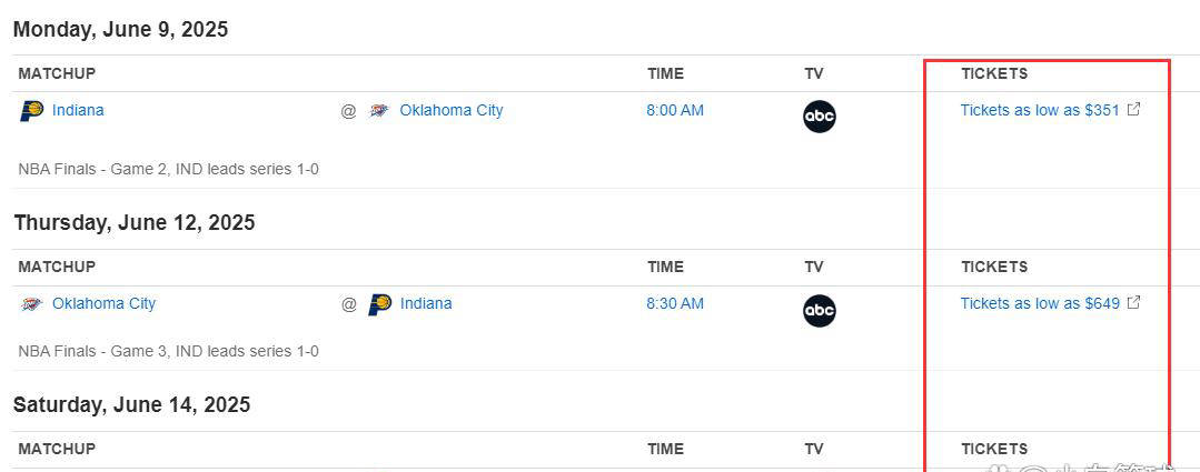 根据票务网站Tickets的数据显示,在雷霆总决赛G2的门票售价为351美元,而步行者G3的门票平均售价已经飙升至649美元,比赛开始后步行者主场门票价格上涨了32%。